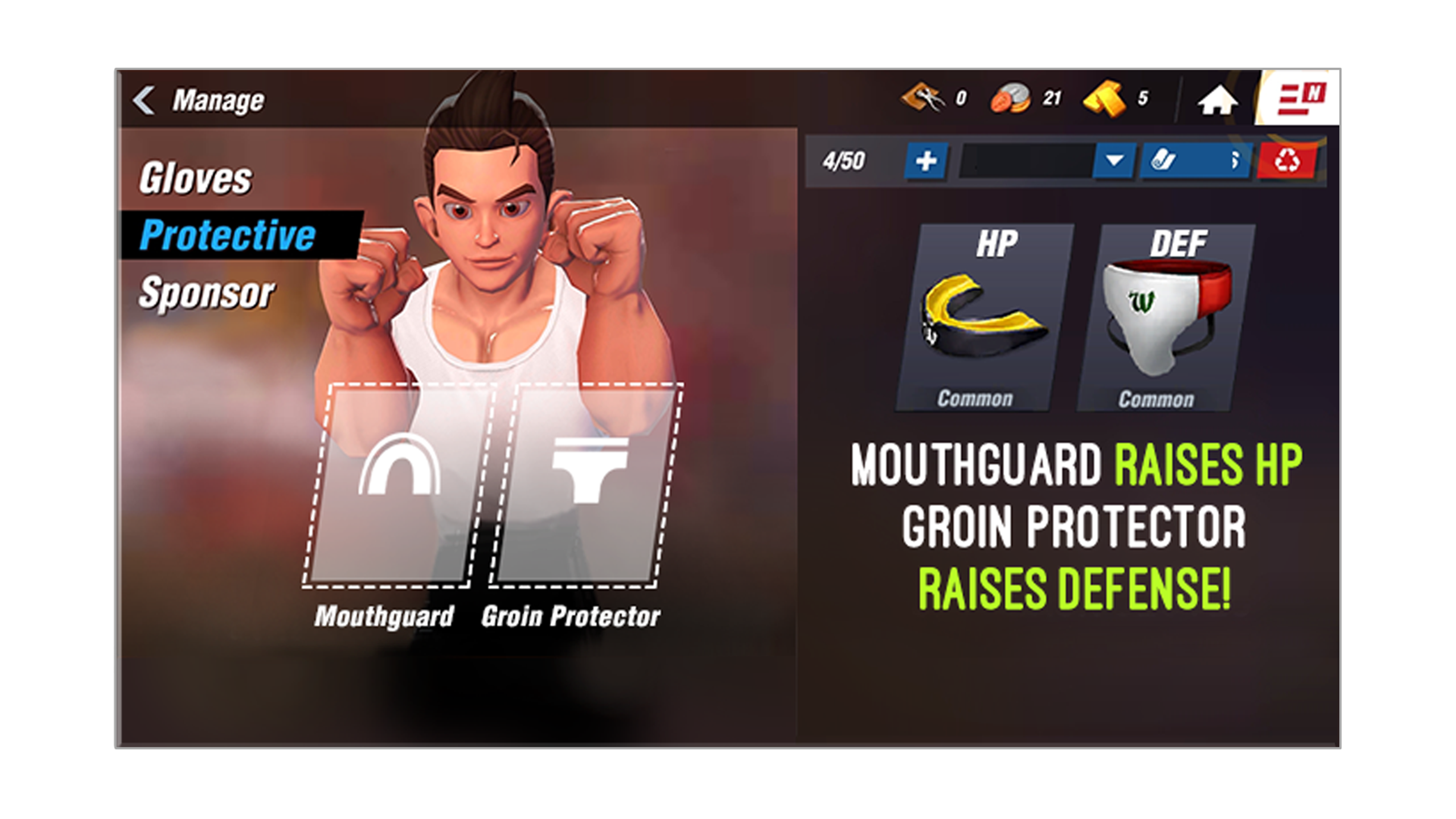 * プロテクター：特定の攻撃（ジャブ、フック、アッパーカット、メガパンチ）に対する防御力を向上させます。